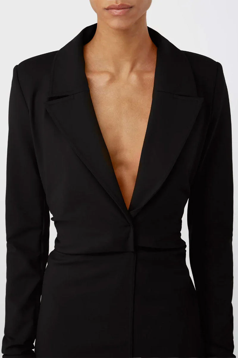 The cut is fitted on the torso, with a high, sharp V neckline and square cap sleeve. The lower half of the dress drapes elegantly, falling to lower calf length for an feminine silhouette.
