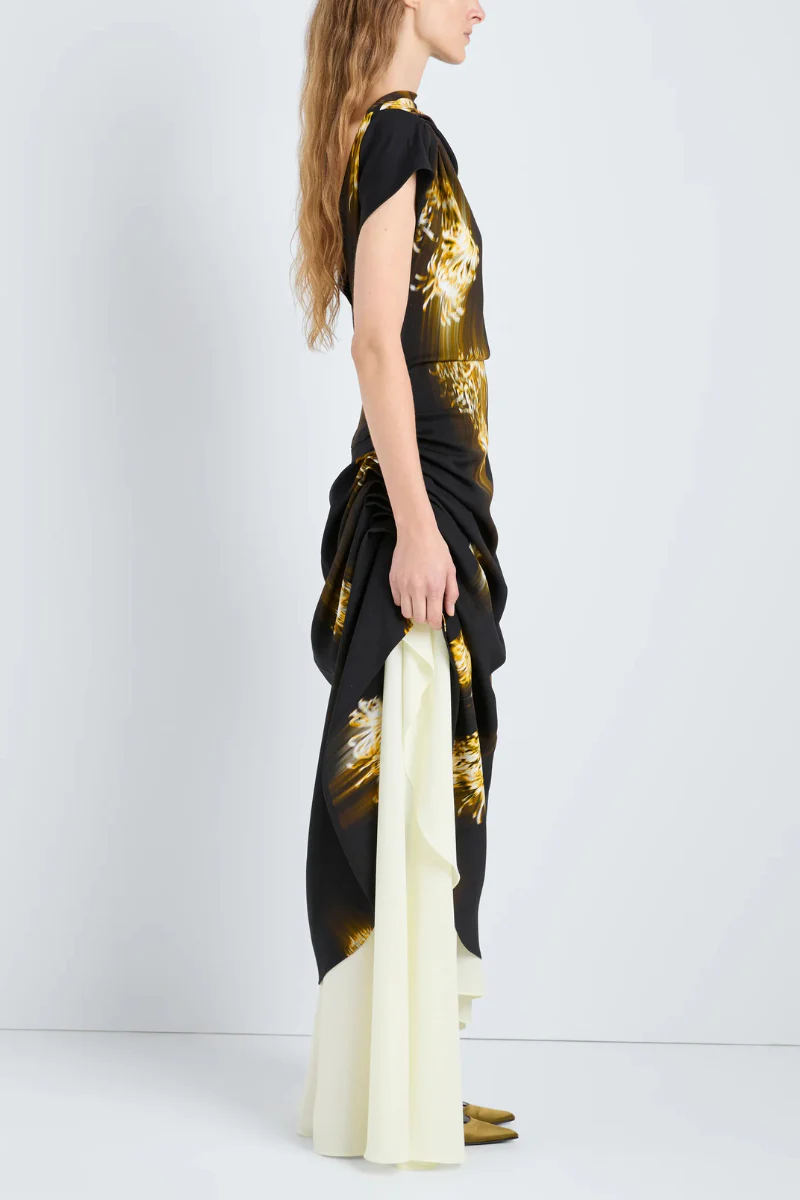 The Antonella Dress in Printed Viscose Cady features a fluid, asymmetrical short-sleeve bodice with pleating fixed at the hip to create an asymmetrical hem, finished with a V-neck at the back. Delicate chrysanthemums are brushed across the print, creating a softly blurred effect. The dress is finished with a removable slip underneath.