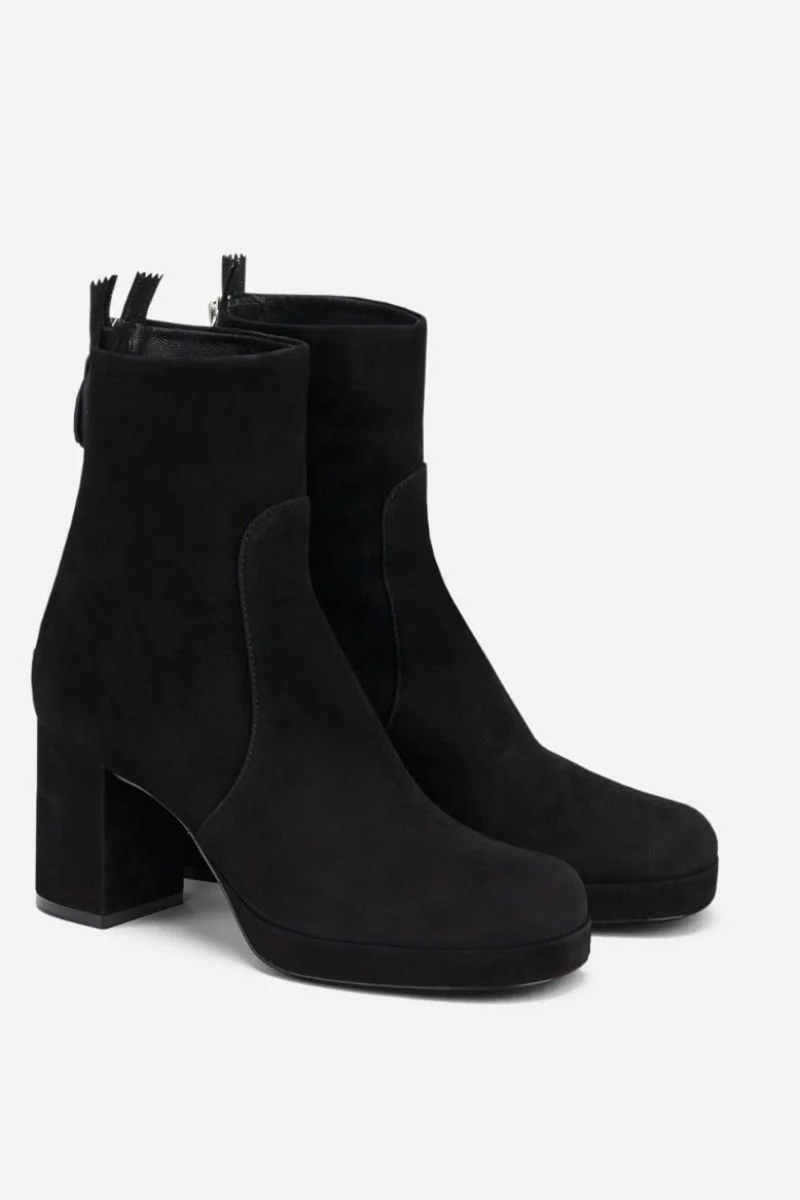 The BETTY velour ankle boot has a slightly squared-off design at the toe, with a block heel and front platform. Simple lines and discreetly elegant.