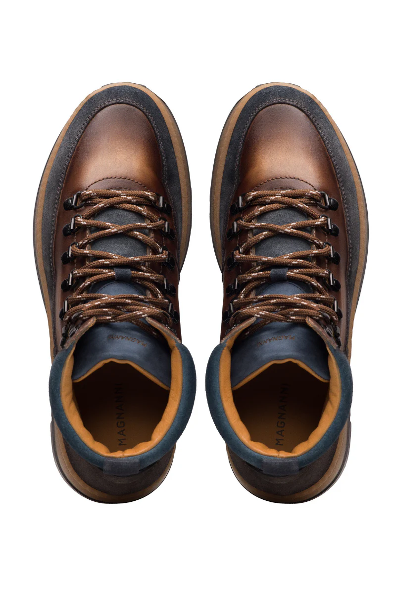 Inspired by the casual hiker boot, the Borazo features robust D-ring eyelets for a rugged appearance and a caramel-colored treaded sole for contrast.