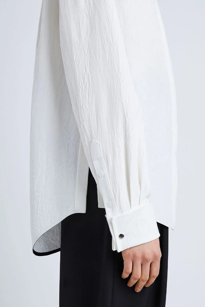 The Crushed Satin Shirt is crafted in crushed matte satin. Fitted with turn-up cuffs and detailed with a lustrous button at the center of the point collar.