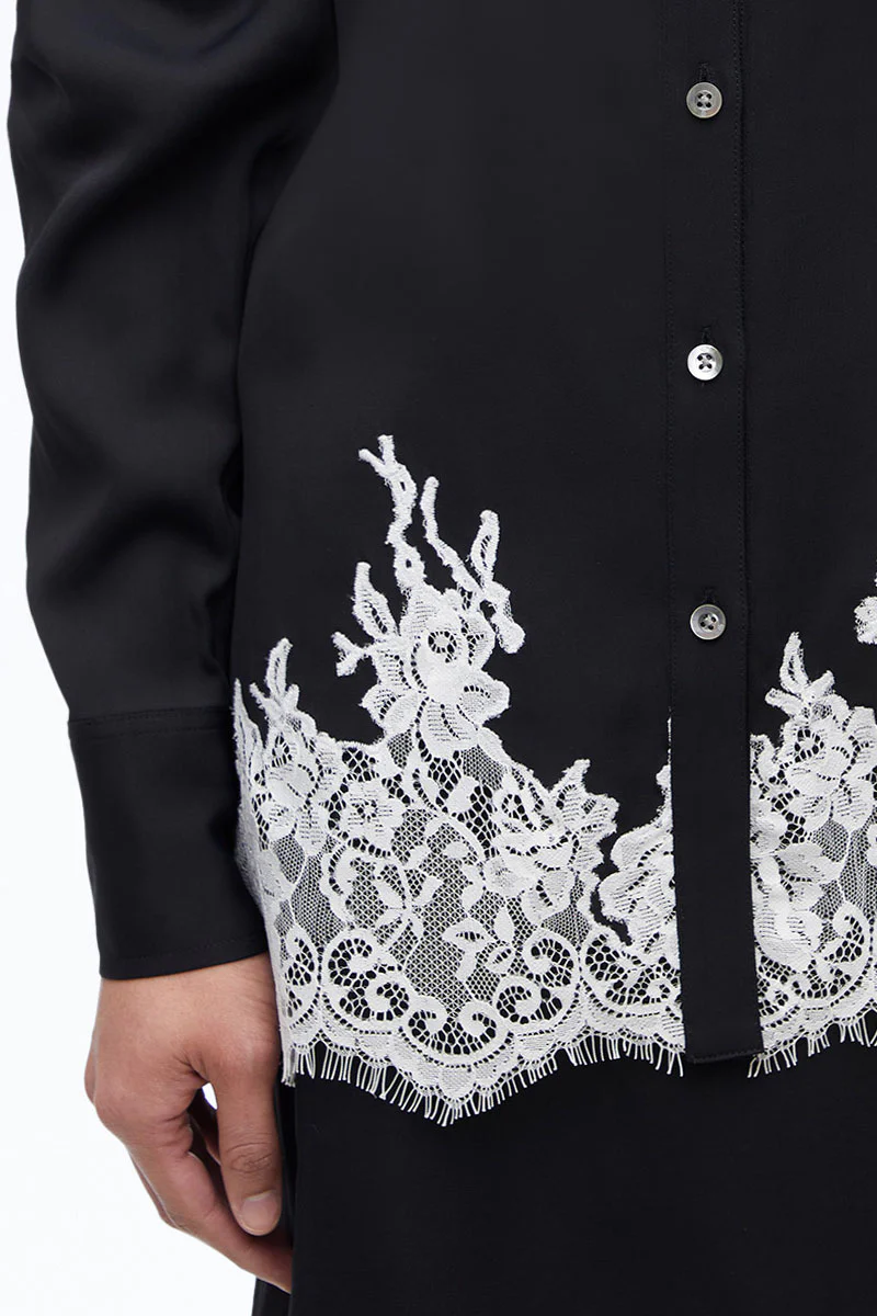 Inspired by New York City's patchworked communities, this shirt is designed in black and descends into elaborate white lace at the hem. It's cut to a simple, smart profile with a point collar and buttoned cuffs.