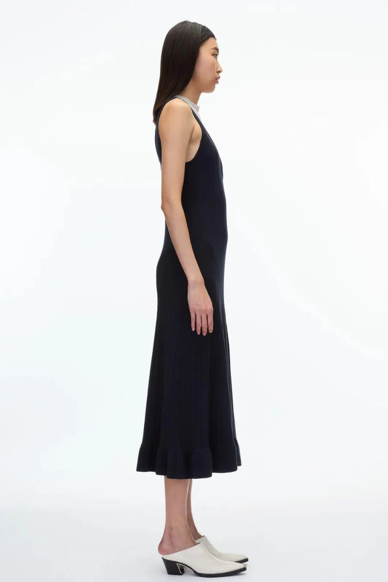 Fitted through the body with a flare hem, this elegantly knitted dress features novelty stitch neck line. Sleeveless and midi in length, its can be dressed up or down. Part of our commitment to sustainable practices, it is knitted with yarn that is manufactured from up to 30% of upcycled consumer waste.