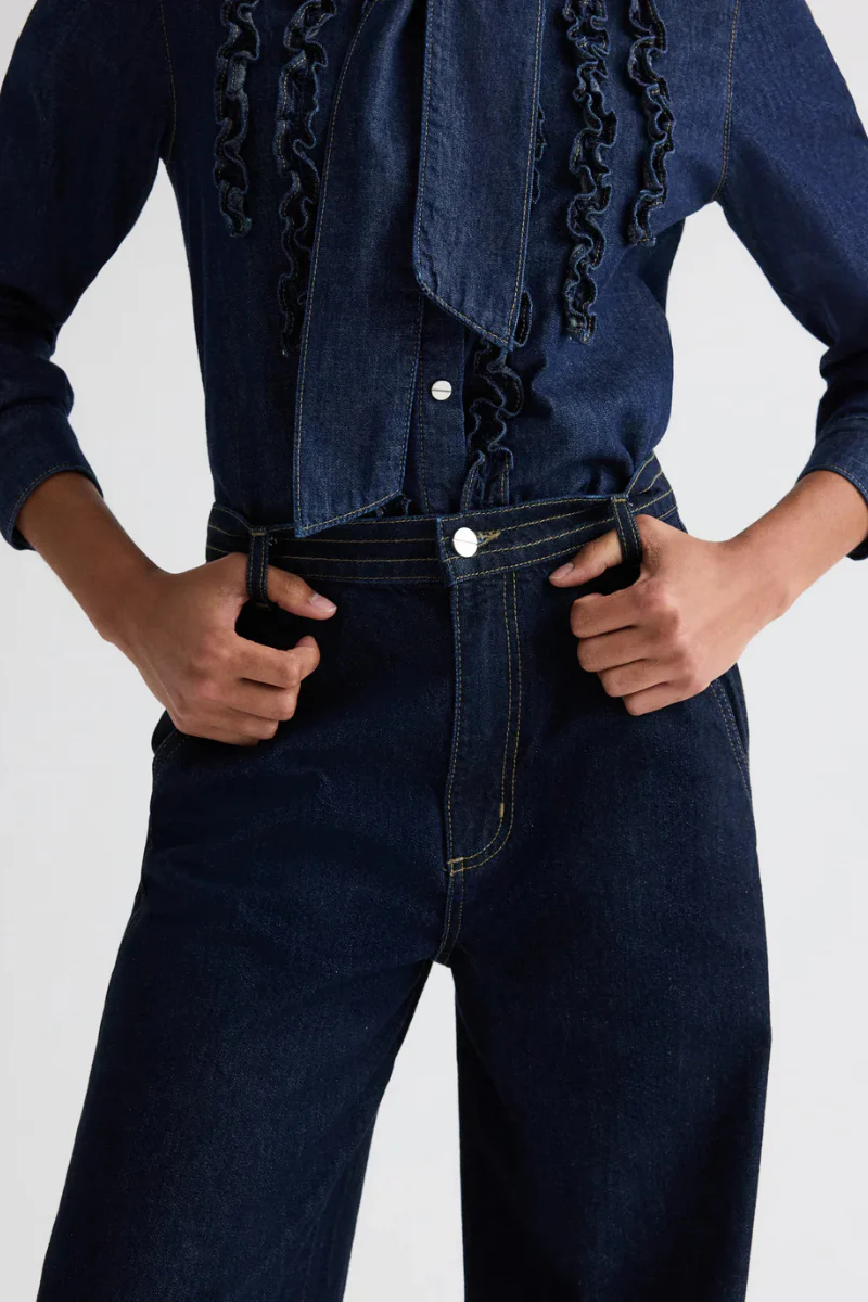 High rise, wide-leg pants in heavy denim. The Mott St is a relaxed silhouette designed with front and back seam detailing for shape. Complete with side pockets, back welt pockets, belt loops, and a concealed zip and button closure.