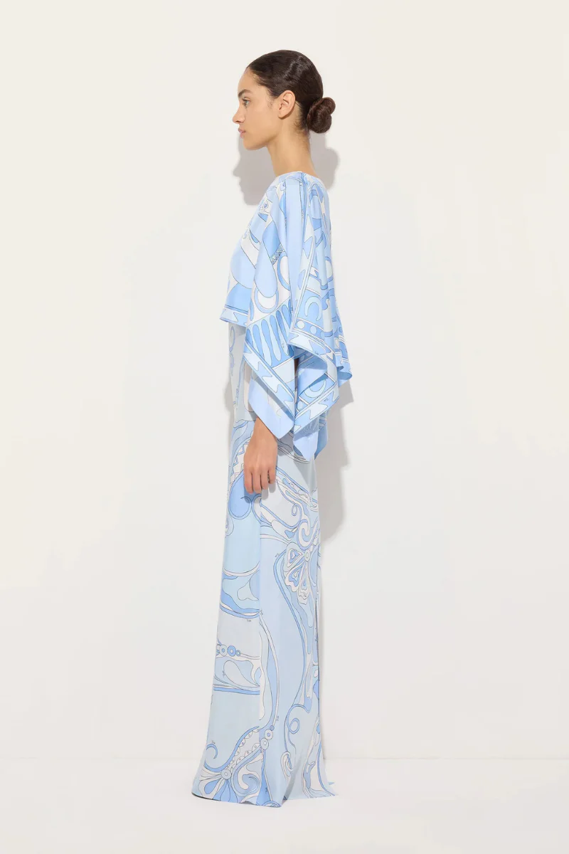 Made from silk twill, this dress features a cape/shawl that delicately envelops the shoulders and flowing, angled sleeves, creating a dynamic and airy silhouette.