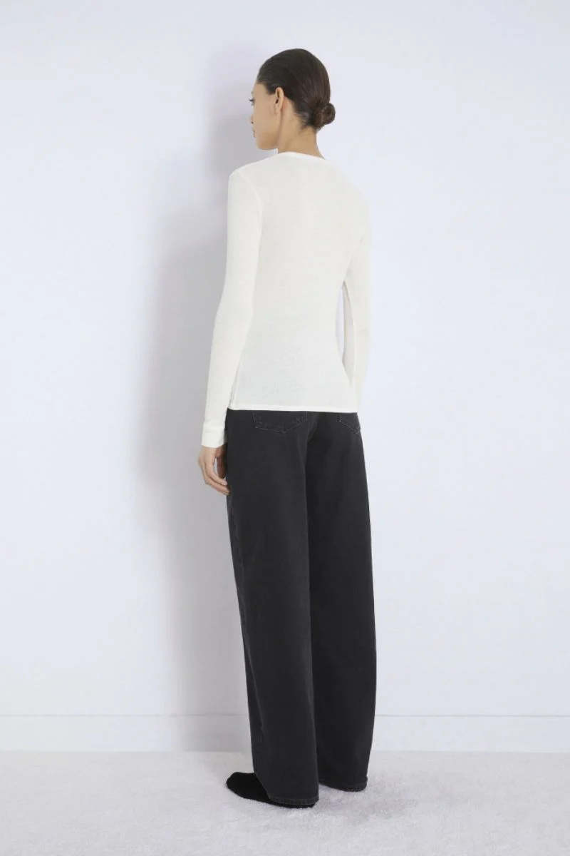 This top is a classic Loulou Studio style made of rib jersey. Its timeless silhouette hugs the body contours like a second skin. Details include a turtleneck and long sleeves. A trademark Loulou Studio seashell is embroidered on its lower left side.