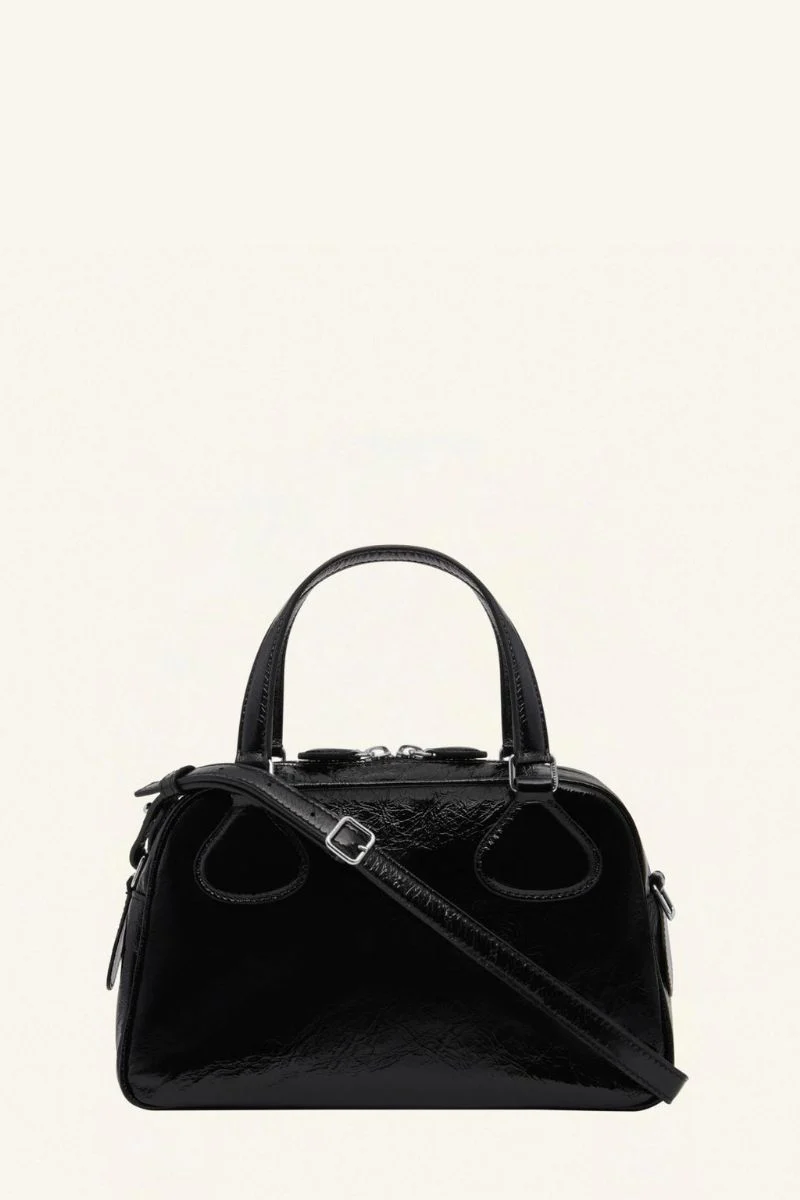 Reedition Bowling Bag in naplack leather with encrusted logo on the front.