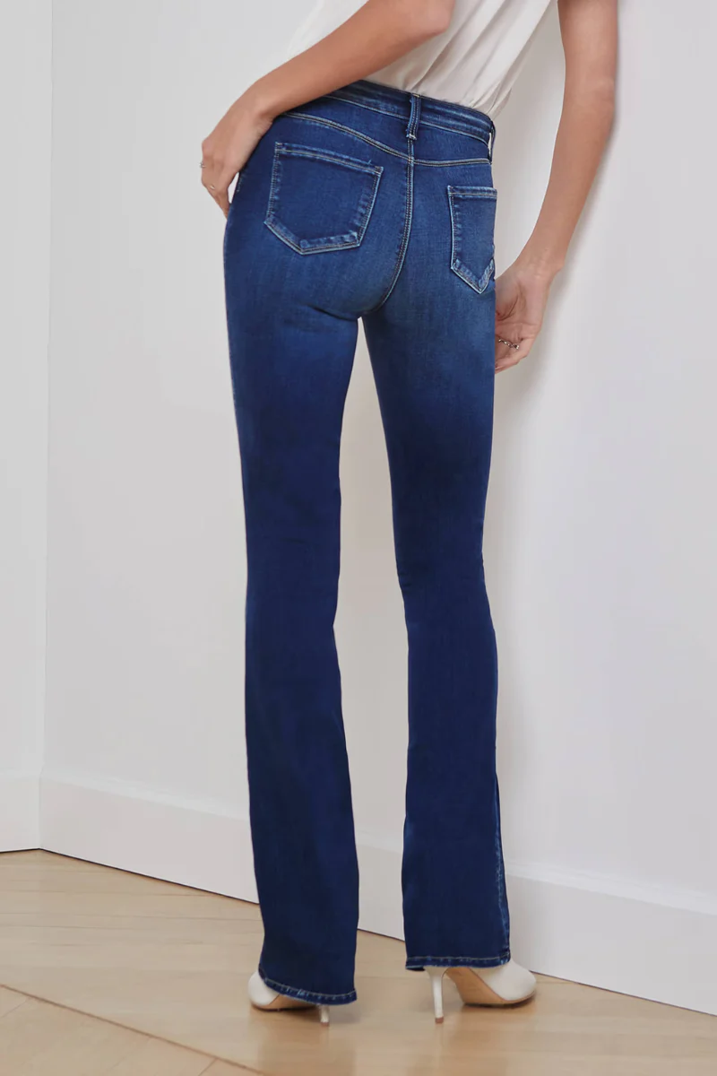 A classic high-rise jean in true-blue premium stretch denim that includes REPREVE, a sustainable, high-performance recycled fiber. Meticulous sanding and whiskering enhance fabric's character. Contoured waistband fits securely at the natural waist, then hugs from hip to knee before releasing into a slim bootcut hem.