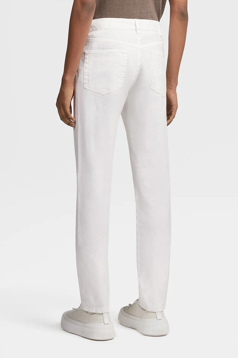 Made from a soft blend of linen and cotton, these jeans feature added stretch for more comfort throughout the day. The slim fit elongates the legs for a sleek silhouette, while the button closure adds a retro-inspired touch. Double belt loops and an embroidered patch on the back sign off the look.