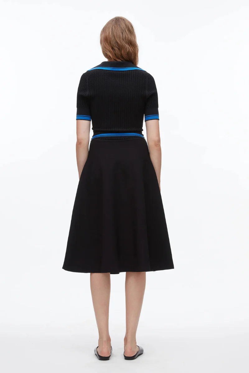 This refined polo dress is knitted from a smooth viscose blend that subtly nods to its athletic origins through crisp contrast stripes. Designed with a clean, body-skimming silhouette, it moves with ease while maintaining a modern, feminine edge