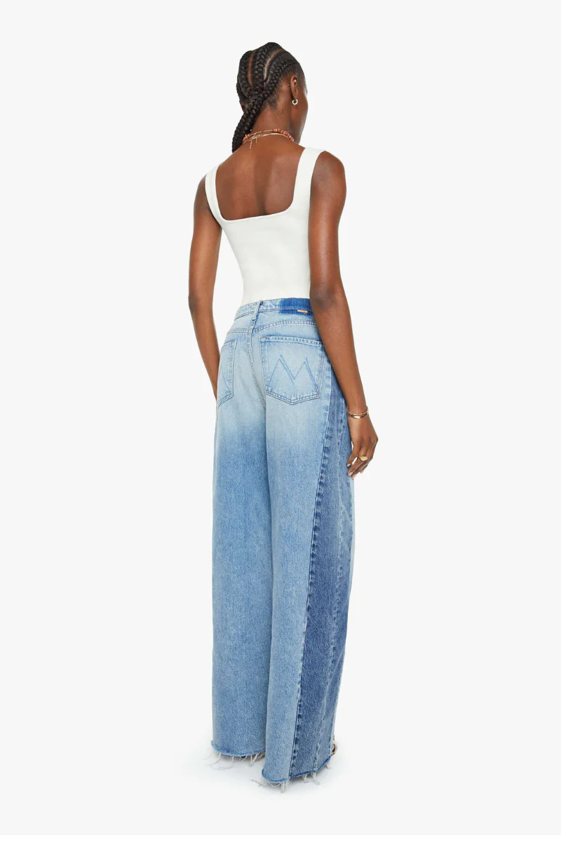 Super high-waisted barrel-leg jeans with a long 31-inch inseam, frayed hem and relaxed fit. Made from rigid SUPERIOR denim, Blinded By The Dark is a light blue with whiskering and fading at the knees and darker inset panels on the outer seams.