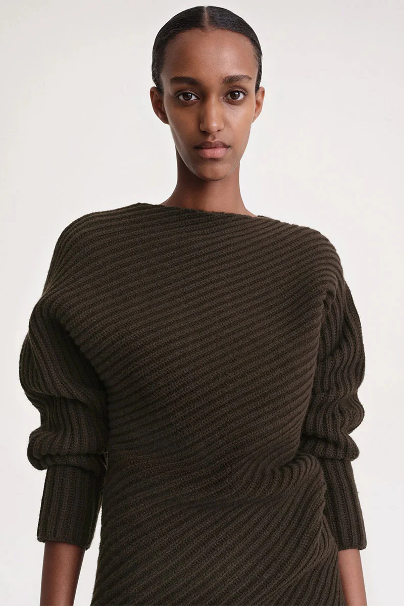 TOTEME sweater knitted with diagonal ribbing which circles around the body to create a twisting optical illusion. It's made from thick, mid-weight wool to a slim longline silhouette with a straight neck and sculptural dolman sleeves connected to the torso. Wear it with trousers to the office.