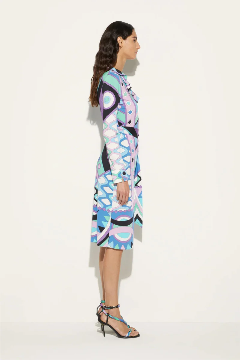 Camille Miceli reimagines the storied Vivara print, covering this dress in blue-hued geometric patterns. It features a classic wrap silhouette cut from satin jersey and is complete with soft frills at the neckline.
