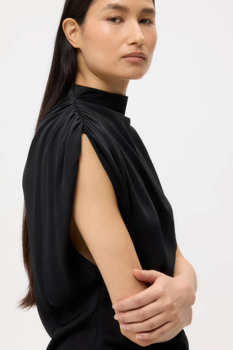 Mock neck, cap sleeved blouse draped in medium weight silk stretch georgette. Wish you would top a loose fit, with a soft drape that skims the body. Complete with a placket trim on one shoulder and pleats on the other shoulder.